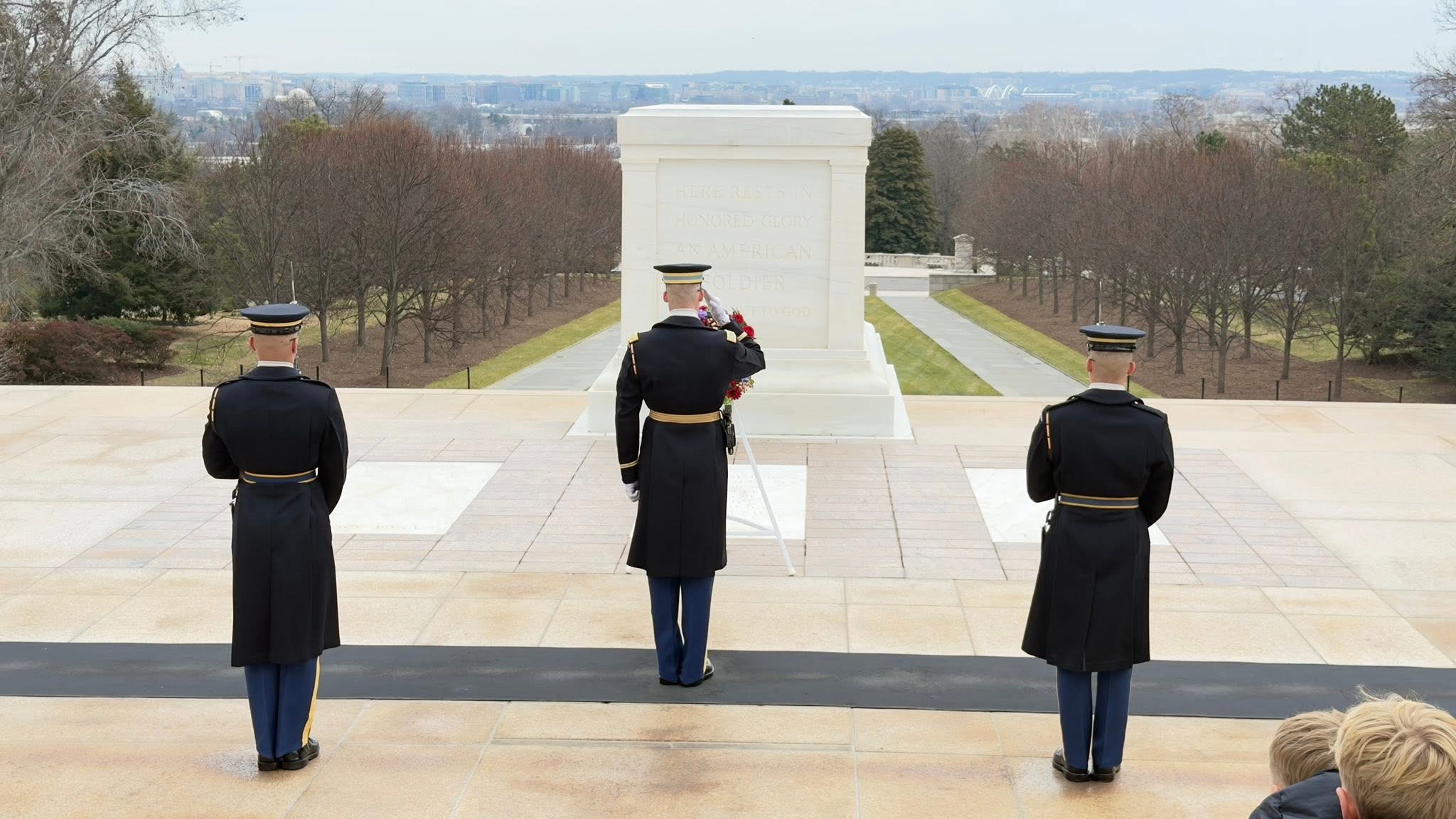 The Tomb of the Unknown Soldier at Arlington National Cemetery, the Cemetery’s most iconic memorial, is watched over every hour of every day, through heat, rain, and snow. Since 1921, the white marble sarcophagus has provided a final resting place for one of America’s unidentified World War I service members, and Unknowns from later wars were added in 1958 and 1984. The tomb has evolved to serve as a place of mourning and a site for reflection on American military service.